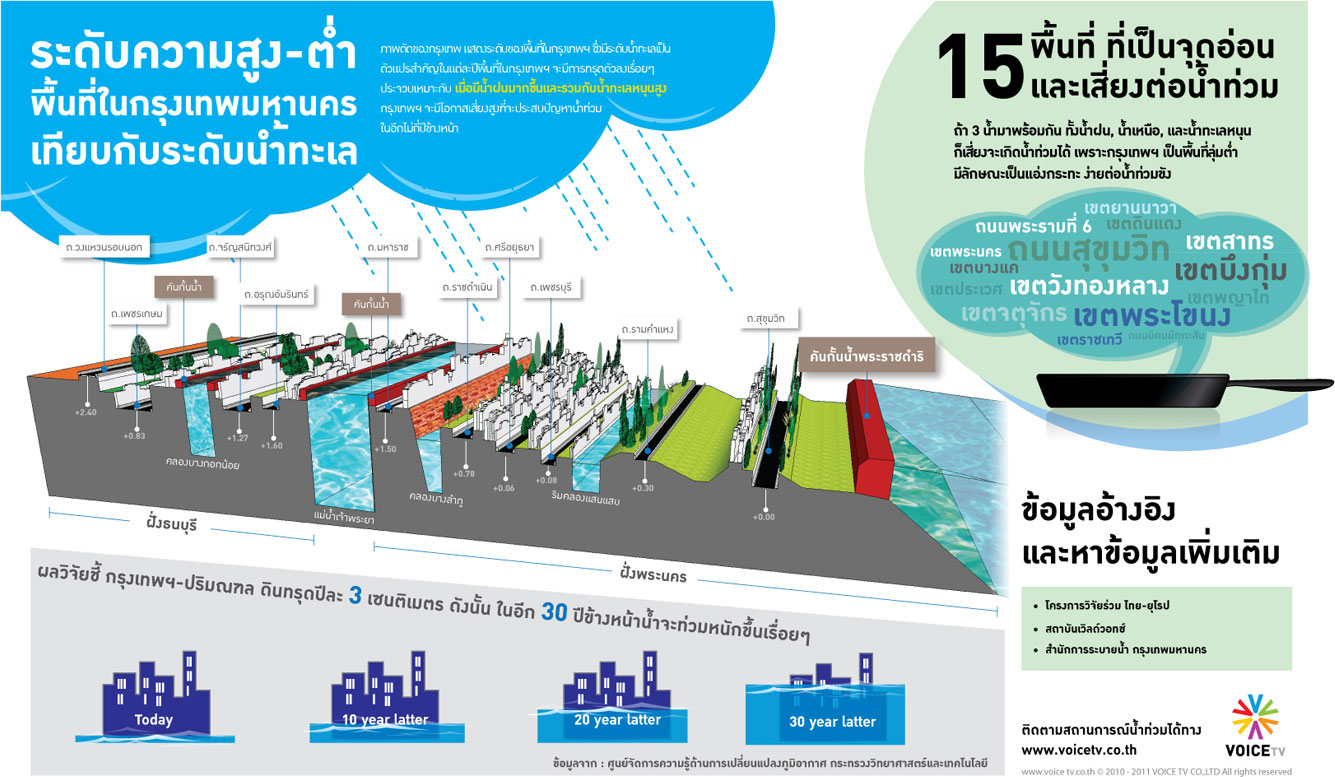 โมเดลแผนที่ล่าสุด 26 ต.ค. 2554![]() **คลิกที่ภาพเพื่อดูขนาดใหญ่** * สีเหลืองเข้ม : พื้นที่ที่โอกาสน้ำเข้าท่วมสูง เนื่องจากปริมาณน้ำด้านเหนือมีมาก ระดับน้ำจะอยู่ที่ 0.5 - 1 เมตร โดยความแรงของน้ำจะขึ้นอยู่กับปริมาณน้ำเหนือคันกั้นน้ำ หากเป็นกรณีน้ำล้นธรรมดา ก็จะค่อยๆซึมขึ้นมาตามท่อระบายน้ำ แต่หากคันกั้นน้ำพัง หรือมีการเปิดประตูน้ำให้น้ำเข้ามา น้ำจะมาเร็วและแรง ซึ่งจะส่งผลกระทบโดยตรงกับชุมชนที่อยู่ในบริเวณใกล้คันกั้นน้ำ และจะค่อยๆลดความแรงต่อไปยังพื้นที่อื่นๆ * สีเหลืองอ่อน : พื้นที่ที่มีความเสี่ยงน้อยกว่าสีเหลืองเข้ม แต่ยังมีโอกาสที่จะท่วมในปริมาณ 0.5 - 1 เมตร โดยความแรงของน้ำที่เข้ามาจะไม่รุนแรงเหมือนสีเหลืองเข้ม * สีส้ม : พื้นที่ที่มีความเสี่ยงสูงที่จะโดนน้ำท่วมมากถึง 1 - 1.5 เมตร ปริมาณน้ำที่เข้ามาจะค่อนข้างรุนแรง ** ทั้งนี้ ในทุกพื้นที่ที่กล่าวมานั้น จะมีปัจจัยอื่นๆมาเกี่ยวข้องทำให้บางพื้นที่อาจท่วมในระดับที่ไม่เท่ากันได้ เช่น ความสูงต่ำของแต่ละพื้นที่ ที่ตั้งของชุมชน - ริมคลอง ริมแม่น้ำ ริมคันกั้นน้ำเป็นต้น |