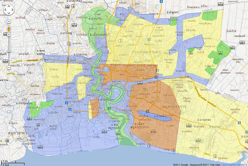 แผนผังคาดการณ์ระดับน้ำท่วมโดย รศ.เสรี (กรณีเลวร้ายที่สุด) |